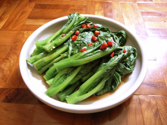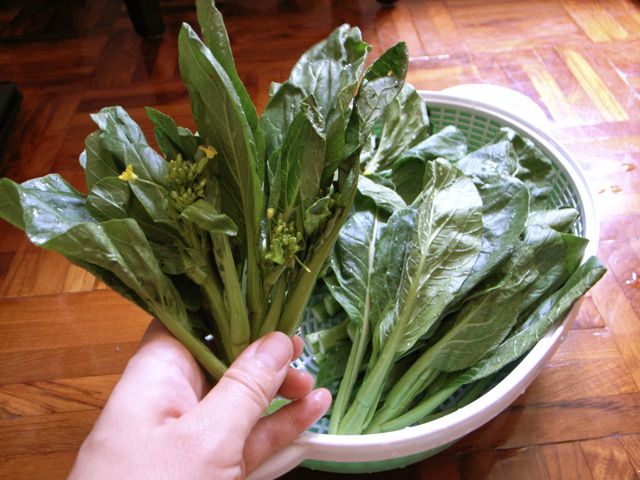 ↑マカオではすごくポピュラーな「菜心(ちょいさむ)」という緑黄色野菜。1キロ130円。味はほうれん草ぽい。サッと塩ゆでします。
