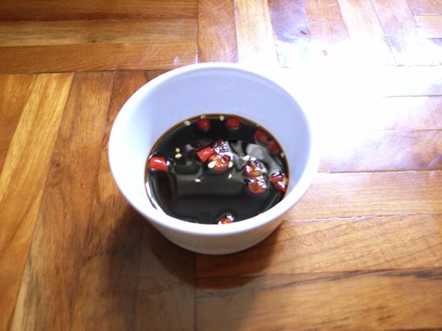 ↑唐辛子をキッチンばさみで輪切りにして醤油につける。マカオの醤油は砂糖などが少量入っていて、日本の醤油よりマイルド。この「チリ&醤油」は鍋を食べる時の定番のタレ。