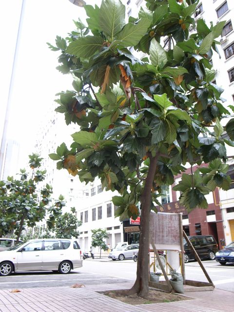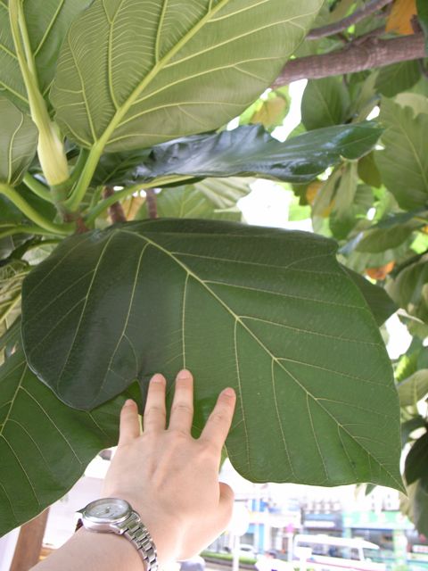 わたしは暑さとは関係なく髪の毛を切りに行きました。途中、葉っぱの大きい街路樹を発見。今まで気付かなかったけど、こりゃおっきい。