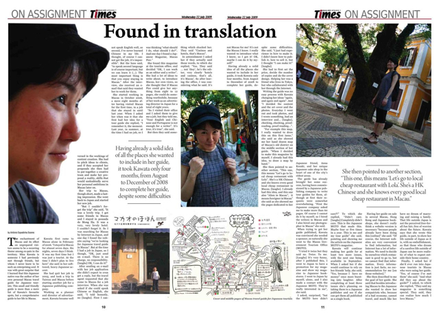 2009年7月22日付の英字新聞Macau Daily Timesのセンター見開き(A2サイズ)で、本というよりわたしが紹介されました。記事のほとんどをわたしのブロークン英語が占めるという大胆な構成。アホに見えるのは重々承知ですが、そこがかえって気に入ってます。Obrigado, António!